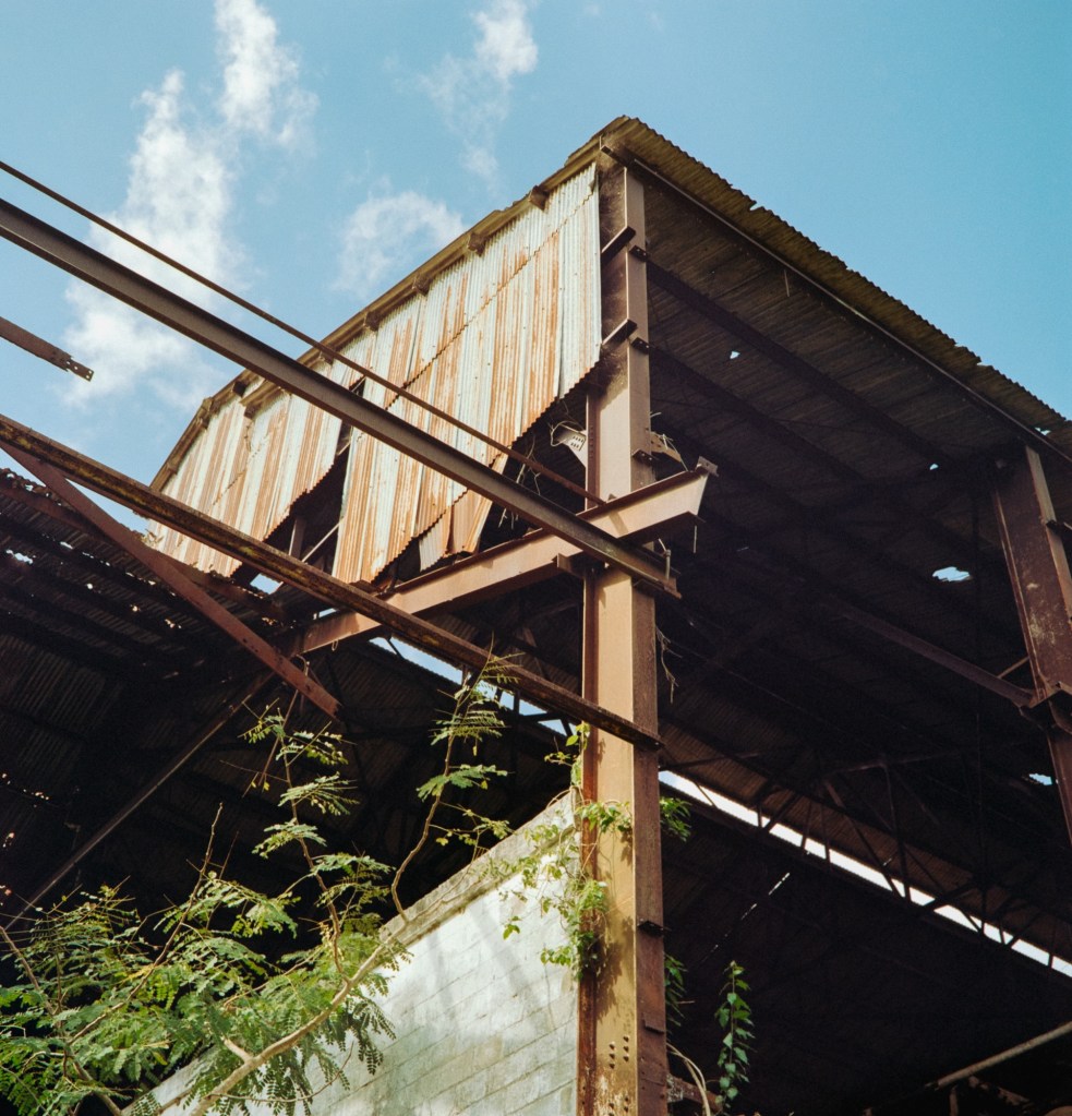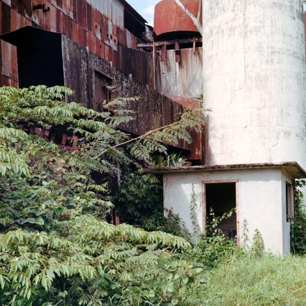 When I joined my Ian to visit the biochar production site, I saw that the site was at an abandoned sugar cane mill. The mill was being overtaken by local vegetation and rust. Close by, on a short walk through the property, were the remains of the train tracks that stretched over a stream.